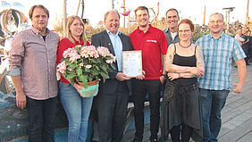 Die Ehrenurkunde und eine neue Pflanze für den Firmengarten wurden mit Stolz von dem Landschaftsplaner Dirk Heydemann, den fleißigen Gärtnern der Stephanus-Werkstätten und Vertretern des CONTAG-Teams entgegengenommen.