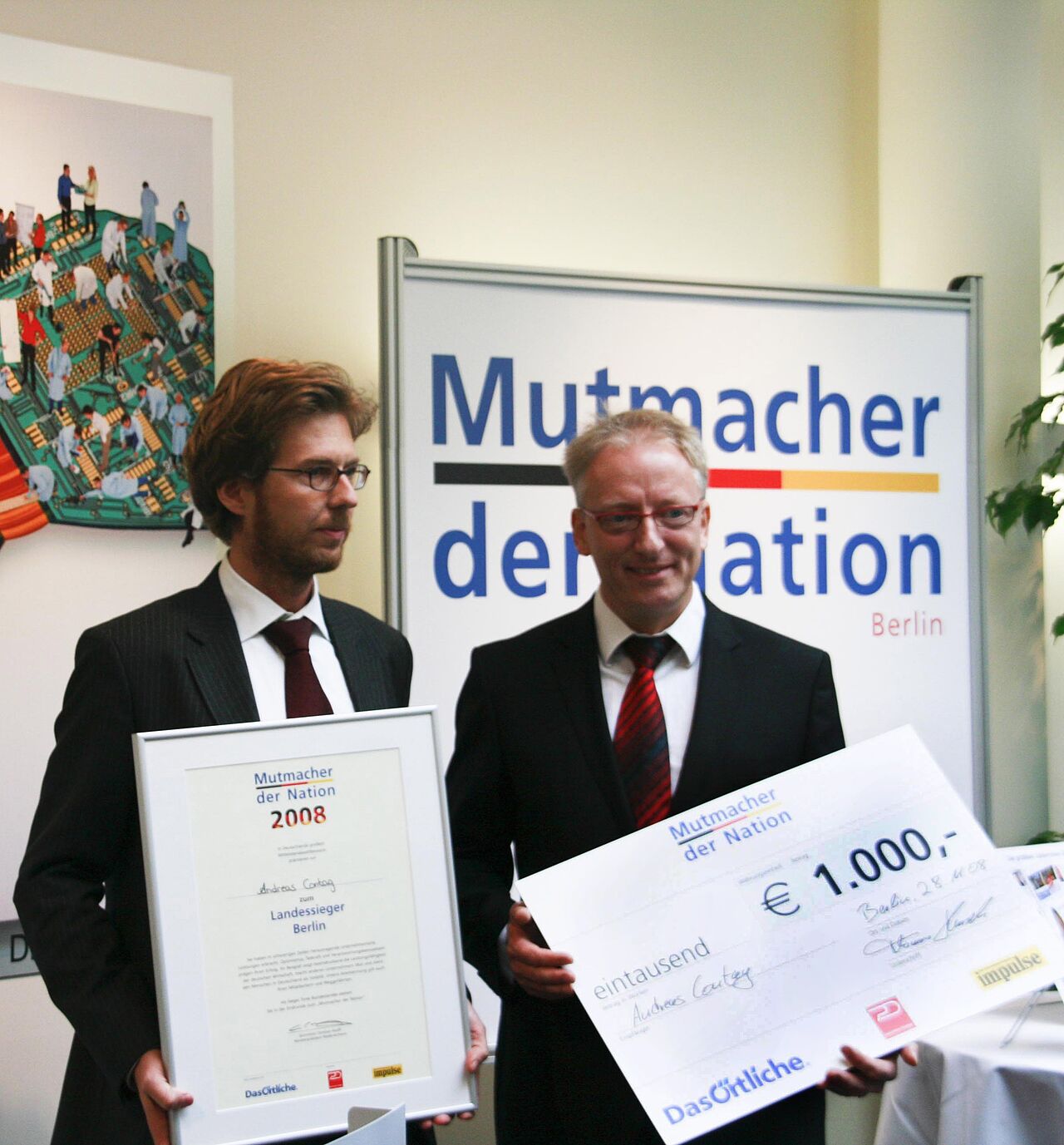 Andreas Contag, Inhaber und Geschäftsführer, wurde als „Mutmacher der Nation“ ausgezeichnet. Diese hohe Ehrung erhielt der Berliner Unternehmer am 28.11.2008 in Anwesenheit von Politik und Presse in feierlichem Rahmen. Der bundesweite Wettbewerb zeichnet die 16 mutigsten Unternehmer Deutschlands aus.